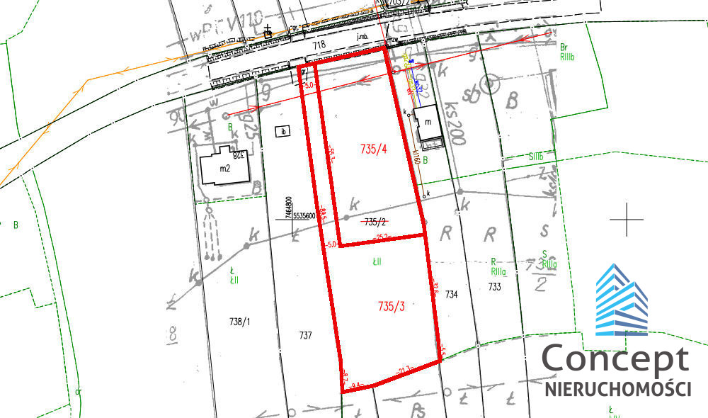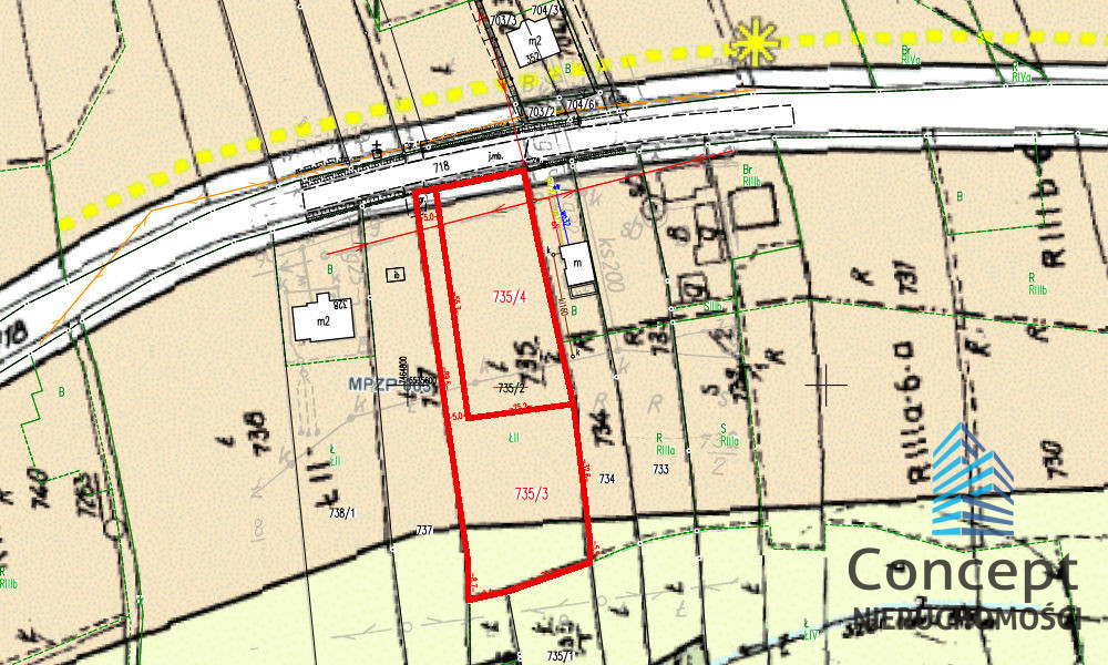 * Działka 735/3, 16 arów, 2 linia zabudowy, teren budowlano-rolny, dojazd drogą asfaltową i około 50 m drogą prywatną polną, wymiary około 30 x 40 metrów plus prywatna droga, należąca do działki!
