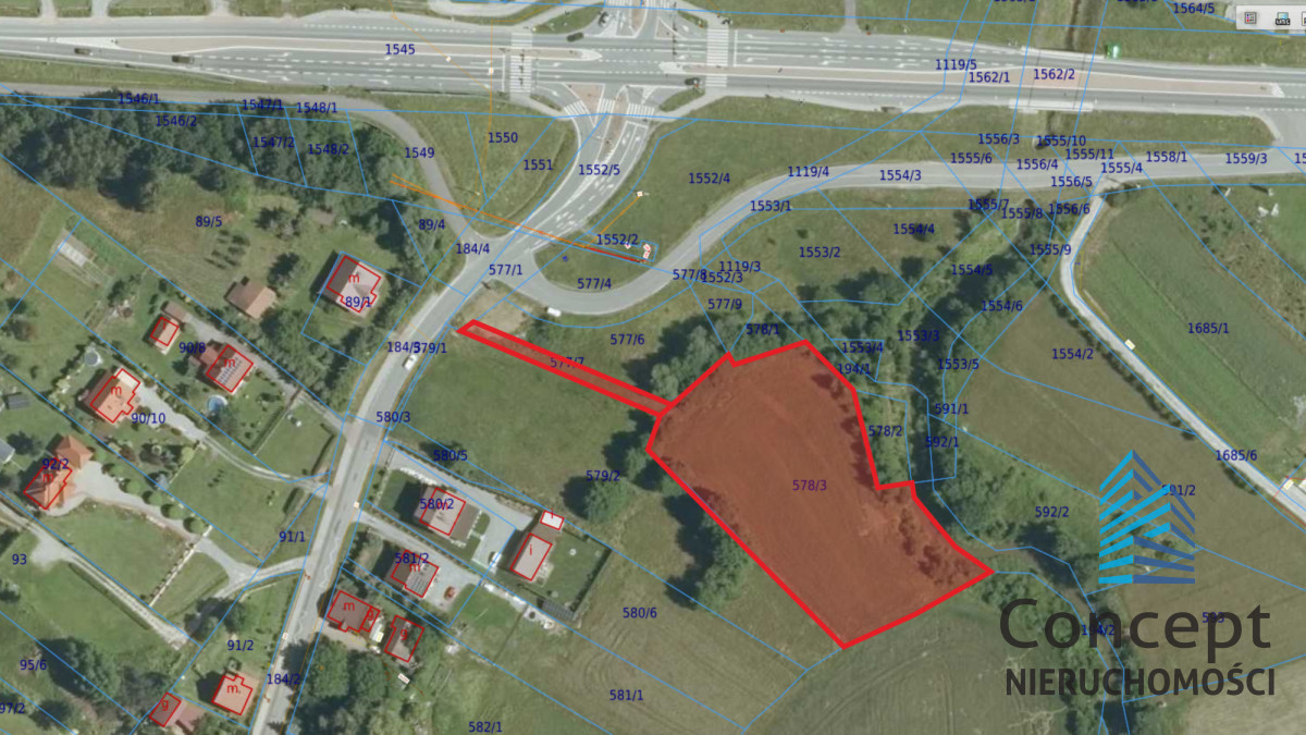 Nieruchomość znajduje się w doskonałym punkcie komunikacyjnym - zaledwie 6 km od Bochni i 45 km od Krakowa. Wjazd na działkę prowadzi bezpośrednio od strony Bochni, a bliskość skrzyżowania z drogą krajową nr 94 (Bochnia - Brzesko) zapewnia świetny dostęp zarówno do miasta, jak i do tras regionalnych.